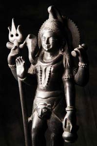 |               He often holds a trident, which represents the Hindu trinity of Brahma, Shiva and Vishnu. It is also said to represent the threefold qualities of nature: creation, preservation and destruction, although preservation is usually attributed to Vishnu. As the destroyer Shiva is dark and terrible, encircled with serpents and a crown of skulls. In the pictures to the right and left Shiva wears sacred Rudraksha beads, perhaps a reference to his earlier name Rudra.  |